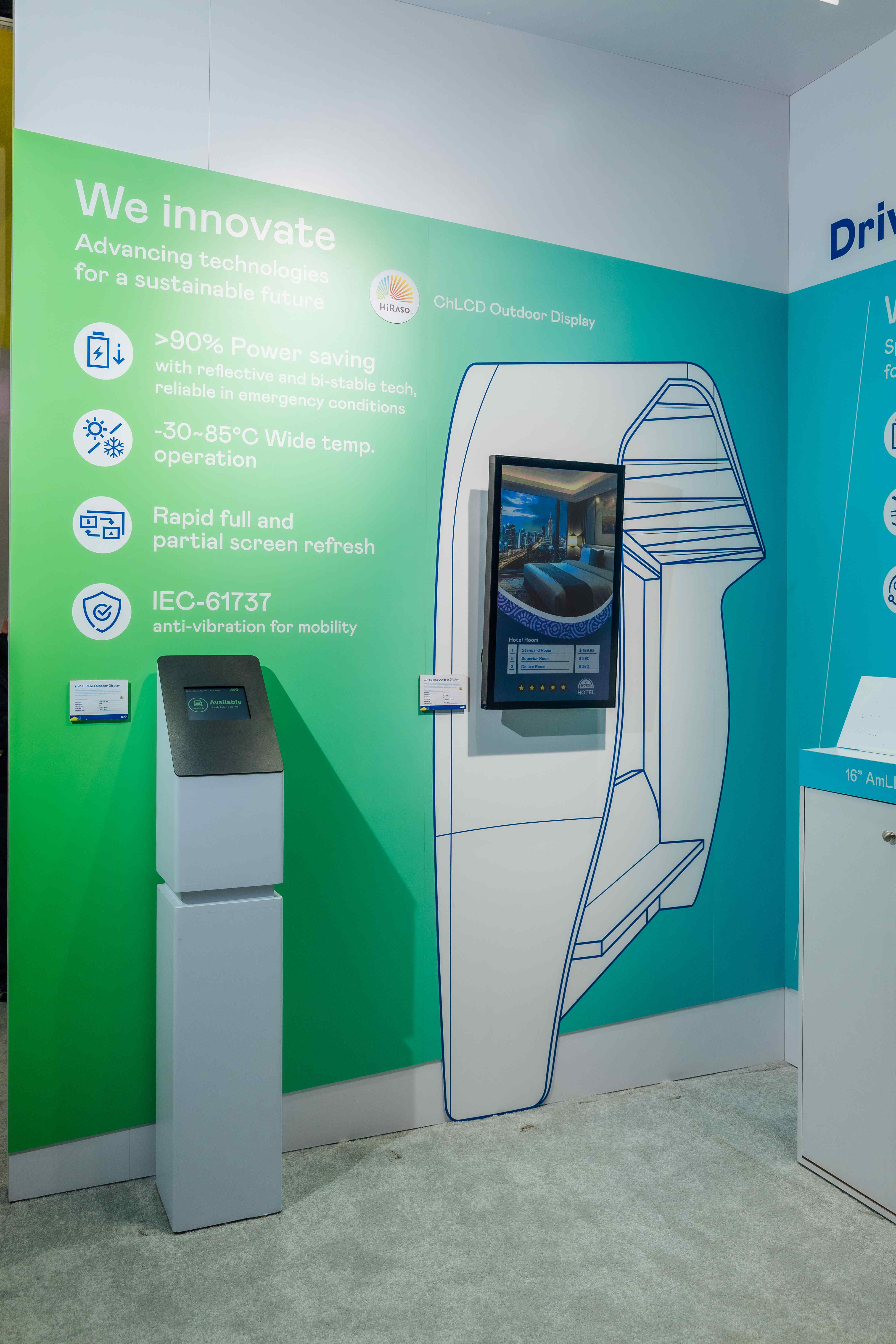 HiRaso膽固醇液晶顯示器運用反射環(huán)境光線的方式,呈現影像顯示時零耗能的環(huán)保省電訴求,光線愈強愈能呈現絕佳的色彩飽和度及顯示效果,同時在攝氏-30度至85度間寬溫的使用優(yōu)勢,為戶外電子看板的新首選。