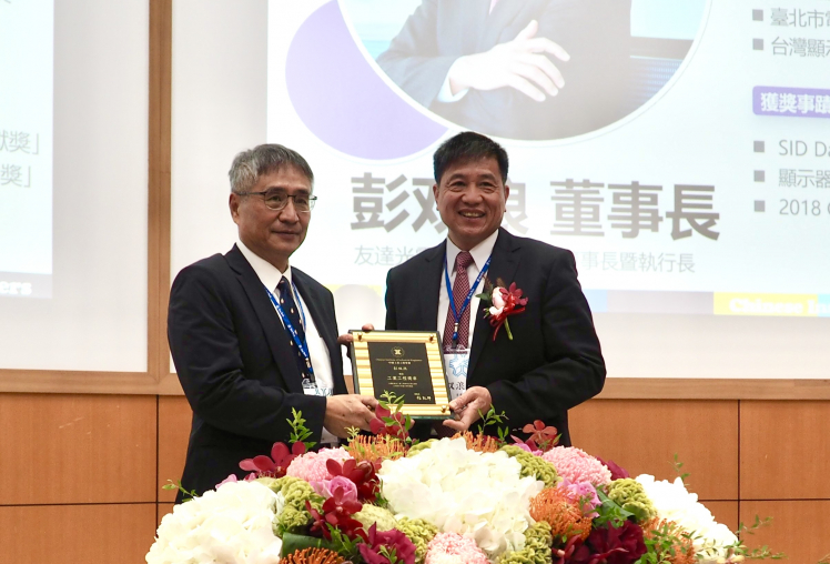 友達董事長彭雙浪獲頒「工業工程獎章-產業貢獻獎」,由中國工業工程學會理事長楊能舒 (左) 頒獎